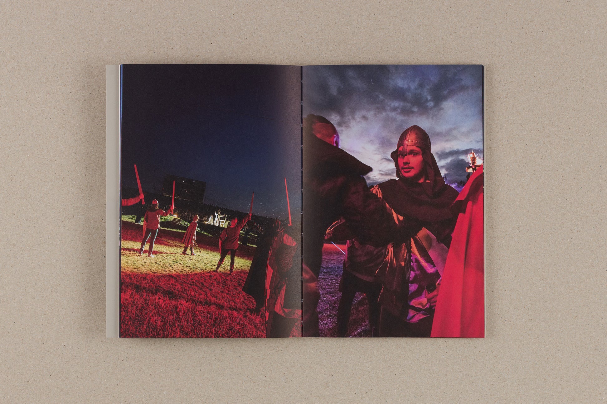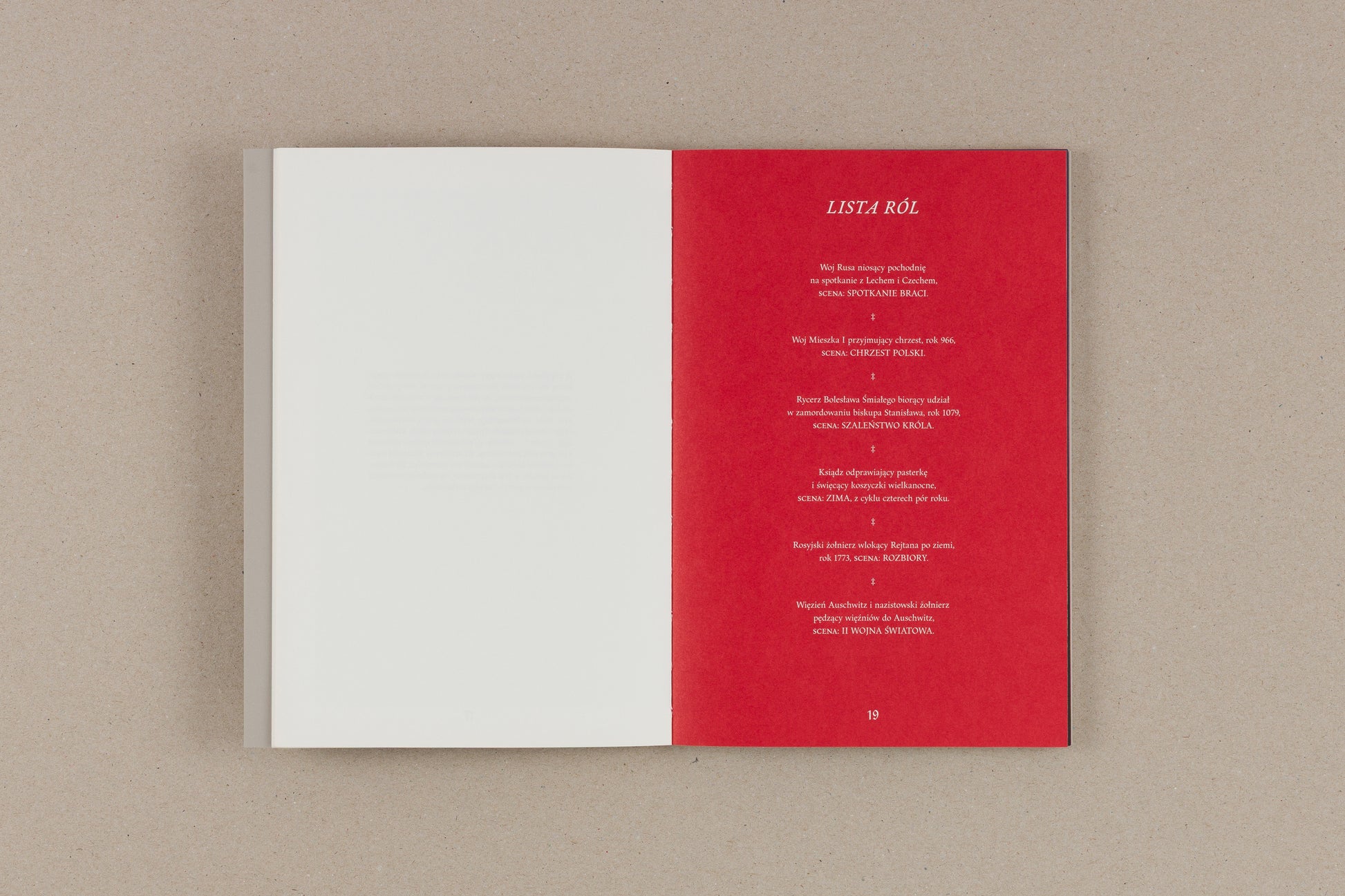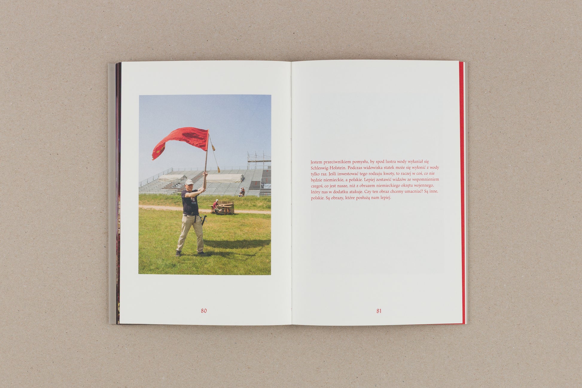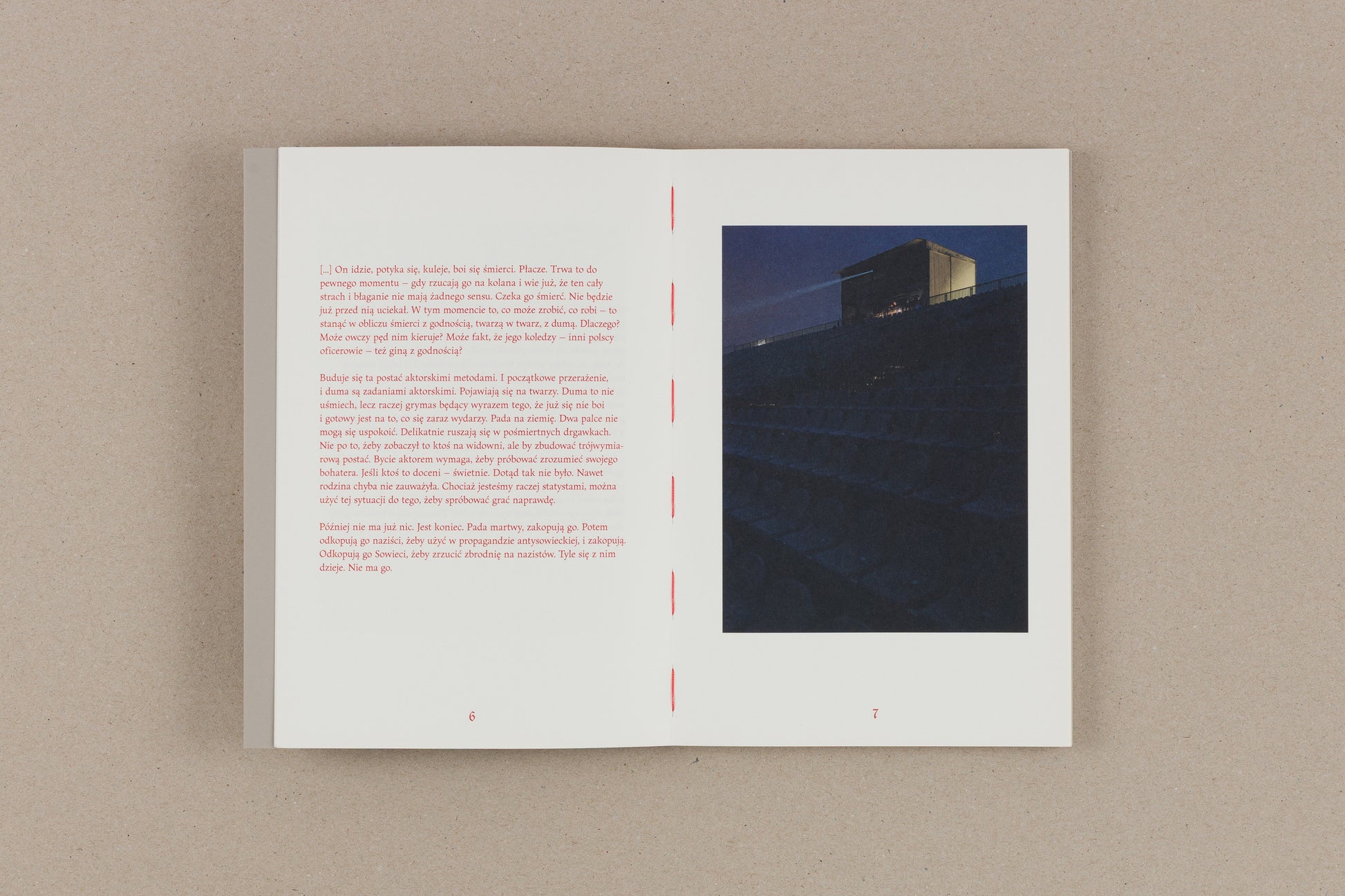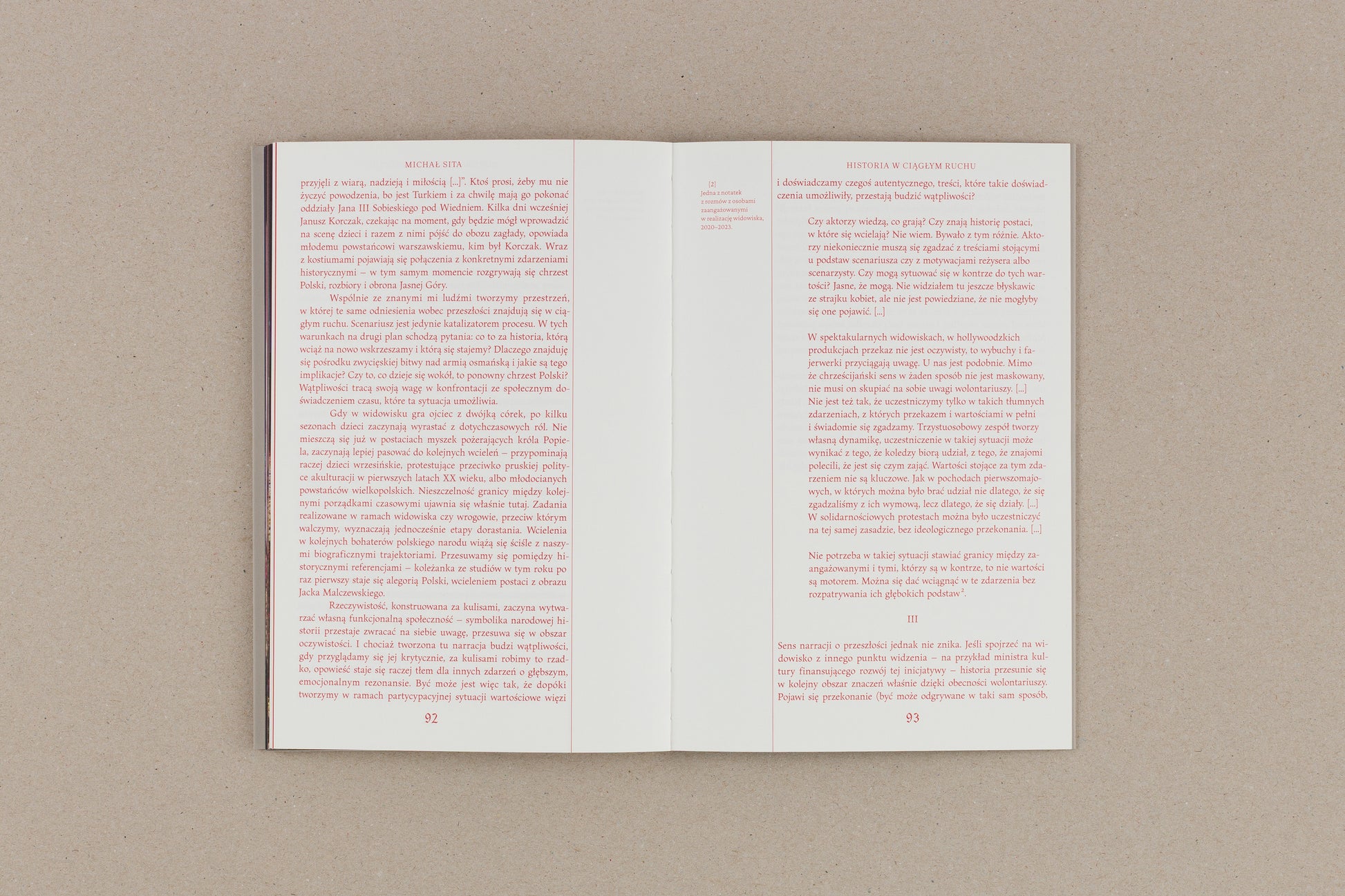 In 2022, when Michał Sita was playing in the performances, he had a small automatic camera hanging around his neck. It was provisionally covered so as not to be visible to the audience, but it was clear to the other actors and organizers that photos were taken. The participants were also fully aware that it was part of the research and the artistic activities the artist was carrying out. Every second the camera (1) recorded the reality of the show from the actor's point of view, (2) recorded events from Polish history as seen through the eyes of one of their participants, (3) commented on the way we give meaning to the past in this participatory action. This automatic recording and photos documenting the show's grounds are the basis of the publication. It is supplemented by notes from interviews with people involved in the show and a short essay.